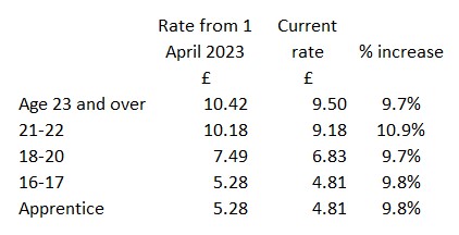• The national minimum wage for 18-20 year olds will increase to £10.85 (8.5%), continuing the narrrowing of the gap between that and the NLW with a view to eventually creating a single adult rate.